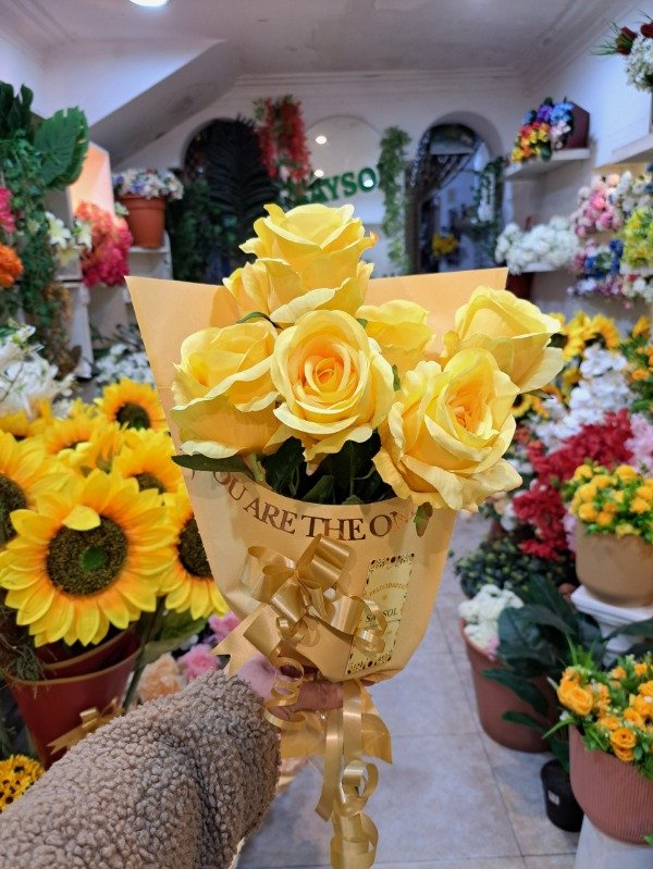 Ramo de 6 rosas medianas realistas envuelto en papel premium con frase "are you the one" en letra dorada para regalo con tarjeta de felicitaciones temática flores amarillas. También se puede optar por una tarjeta más grande para escribir dedicatoria.