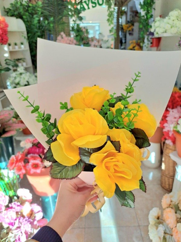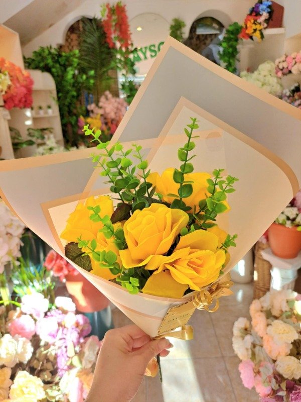 Ramo de 6 rosas medianas con follaje envuelto en papel premium para regalo con tarjeta de felicitaciones temática flores amarillas. También se puede optar por una tarjeta más grande para escribir dedicatoria.
